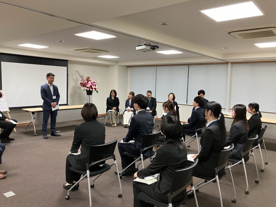 新卒研修では、会社という組織を学ぶところからスタートです。その後ビジネスマナーや自己マネジメントについての研修も受けます。